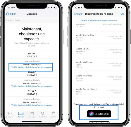 Pour surveiller la disponibilité d’un produit, il faut aller sur une page de produit, appuyer sur “Vérifier la disponibilité“. Descendre en bas de la page, il y a un badge “Ajouter à Siri“, appuyer dessus pour configurer ce raccourci Siri et l’utiliser.