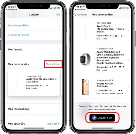 Pour surveiller le statut d’une commande récente, il suffit d’aller sur son profil dans l’app, puis afficher toutes vos commandes récentes. En bas de la page, il y a un badge “Ajouter à Siri“, appuyer dessus pour configurer ce raccourci Siri et l’utiliser.