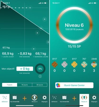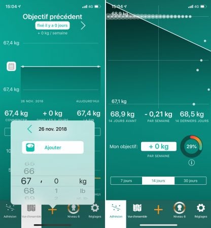 L’utilisateur peut ainsi savoir combien il a perdu ou gagné de poids, sur une période de 7, 14 et 30 jours. À noter que les données de poids peuvent être synchronisées avec l’application Santé d’Apple.