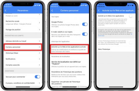 Celle-ci se trouve dans les paramètres de l’app Google Maps. Aller à la section “Contenu personnel” et sur la nouvelle page, assurez-vous de désactiver “Activité sur le Web et les applications“, ainsi que “l’Historique des positions” si ce n’est pas déjà fait.