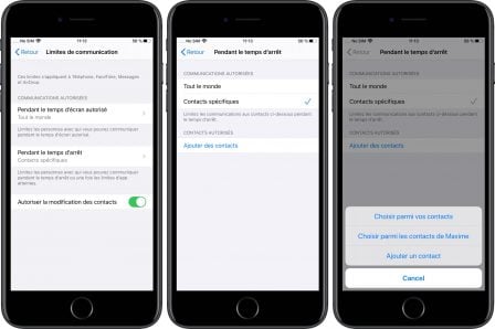 Il est possible de limiter les personnes avec qui le jeune utilisateur peut communiquer, pendant que le temps d’écran est autorisé. Le parent peut autoriser tout le monde, ou bien limiter aux contacts qui sont dans le carnet d’adresses.
