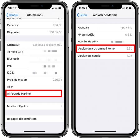 La nouvelle page indique différentes informations sur les AirPods et notamment la version du programme interne. Cette ligne devrait indiquer 6.3.2. Si ce n’est pas le cas, il faut attendre que la mise à jour des AirPods se fasse automatiquement quand ils sont connectés à un iPhone. Il n’y a aucun moyen de forcer manuellement cette mise à jour.