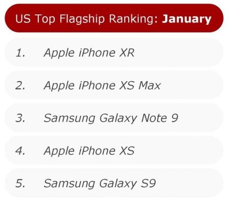 Samsung est en troisième position avec le Galaxy Note 9 et le Galaxy S9 à la cinquième place. Ses nouveaux smartphones Galaxy S10 n’étaient pas encore disponibles en janvier. Il est possible que la situation s’inverse les mois suivants, avec les nouveaux modèles de la gamme Galaxy de Samsung.