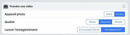 - Prendre une vidéo : lance l’enregistrement d’une vidéo avec l’appareil photo indiqué, avant ou arrière