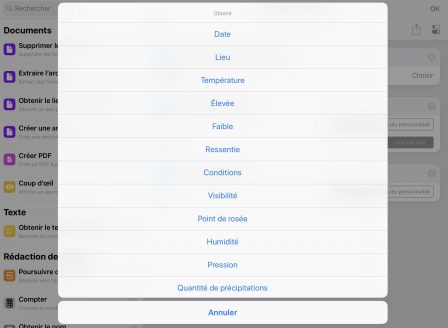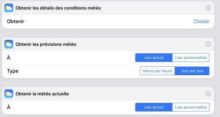 - Obtenir les prévisions météo : pour obtenir la météo à venir dans les heures suivantes ou la journée même, dans le cadre d’un raccourci du matin, par exemple