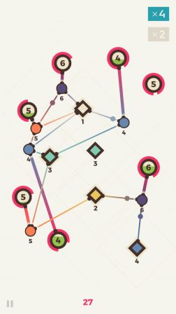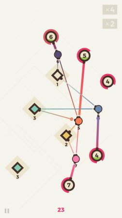 Le joueur doit ainsi créer des noeuds de raccordement entre deux sources, pour ensuite faire naitre un lien vers la cible visée. Au fil de la partie apparaissent des cibles un peu partout à l’écran, présentant à chaque fois un chiffre différent.