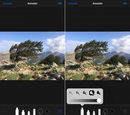 - Il y a 5 grosseurs de traits différentes proposées pour les outils de marquages Stylo, Feutre et Crayon : un appui long sur l’un des trois outils permet d’affiche l’option