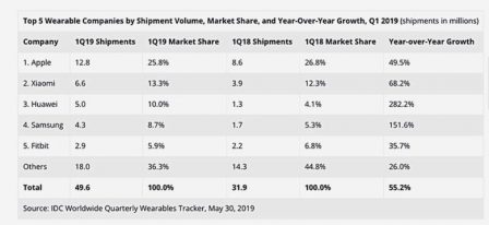 La firme d’analyse IDC estime qu’au cours du premier trimestre de 2019, Apple aurait vendu 12,8 millions d’Apple Watch, AirPods et casques Beats, soit 4,2 millions d’unités en plus par rapport à la même période en 2018, soit une part de marché des wearables de 25,8 %.