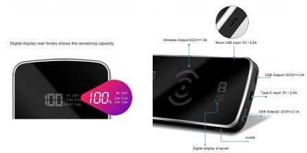 Promo flash : élégante batterie 10 000 mAh, recharge induction Qi intégrée et indicateur numérique de niveau de charge