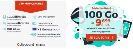 - C’est ici pour s’abonner au forfait Cdiscount voix et SMS/MMS illimités + 100 Go pour 9,99 euros mensuels