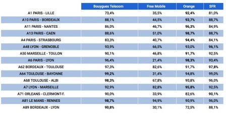 Les résultats axe par axe montrent en tout cas de grandes inégalités. Dans certains cas, Bouygues Télécom est largement en retard sur Orange et SFR, comme sur la A1. D’autres fois, c’est Orange qui est plus en difficulté, comme sur la A89.