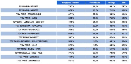 Concernant les trains, les classements se ressemblent pour les TGV, et les RER et Intercités. Dans ces cas-là, Orange est devant, suivi par SFR et Bouygues légèrement derrière.
