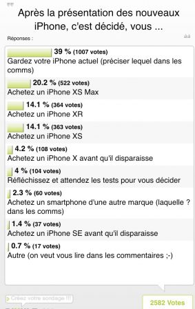Sur plus de 2 580 participants, on remarque que la réponse majoritaire est “Je garde mon iPhone”, avec 39 % des votes. S’en suit l’iPhone XS Max, avec 20,2 % des votes, puis l’iPhone XR et l’iPhone XS avec tous les deux un score identique de 14,1 % (un seul vote de différence).
