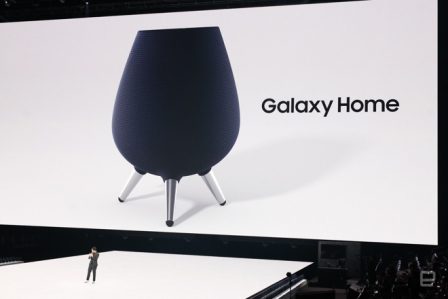 La firme coréenne se lance dans le marché des enceintes connectées, avec son propre modèle, la Galaxy Home. Cette dernière utilise l’assistant vocal de Samsung, Bixby. Elle propose un design assez unique avec trois pieds métalliques, et des embouts pour absorber les vibrations.