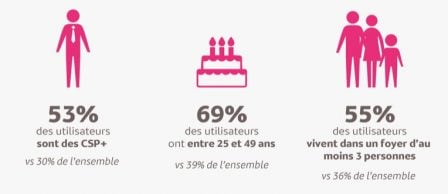 L’utilisateur moyen est âgé de 39 ans. Il appartient à la catégorie socioprofessionnelle supérieure et vit dans un foyer de 3 personnes ou plus. La tranche d’âge la plus à même d’utiliser une enceinte connectée en France est celle des 25-49 ans, à 69 %.