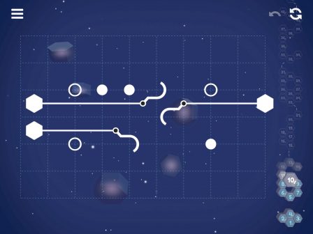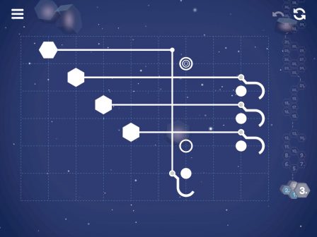 Le développeur a bien évidemment tenté de corser l’affaire avec divers obstacles et mécaniques à prendre en compte. Il est notamment possible de retourner un crochet pour le faire changer de sens, ou d’accrocher deux crochets ensemble pour débloquer certaines situations. La fiche App Store précise d’ailleurs que chaque casse-tête peut être résolu de différentes manières. Cela laisse du coup au joueur un large éventail de solutions et une certaine liberté dans sa manière de progresser dans l’arbre des niveaux.