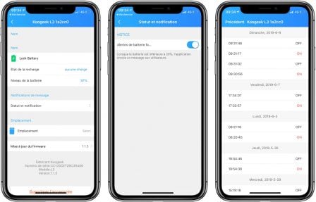 Des notifications sont aussi reçues sur l’iPhone et/ou iPad du foyer, lors de chaque ouverture et fermeture. Pour peu que l’on soit loin de chez soi, et qu’un concentrateur Homekit soit à portée Bluetooth du cadenas (iPad, Apple TV ou Homepod), alors on est prévenu de chaque action sur le cadenas, qu’elle soit effectuée via Homekit ou via une empreinte. Les alertes sont paramétrables et peuvent être désactivées.