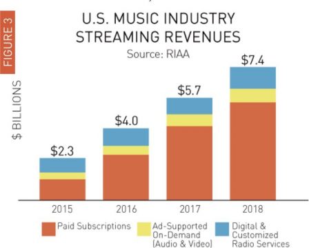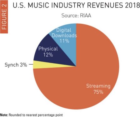 D’après les chiffres de la RIAA, 75 % des revenus de l’industrie de la musique proviennent des services de streaming comme Apple Music, Spotify, Google Play Music et plusieurs autres. Les revenus provenant des services de streaming ont augmenté de 30 % par rapport à 2017, pour atteindre un chiffre de 7,4 milliards de dollars en 2018.