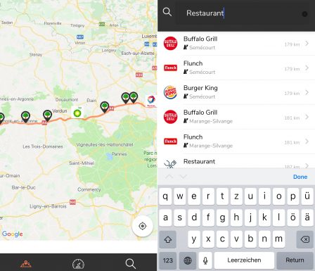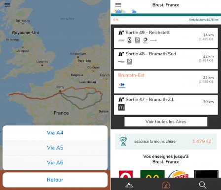 Lors de l’ouverture, l’app demande à l’utilisateur de renseigner une destination, puis de choisir le ou les axes autoroutiers à utiliser. Ensuite, elle affiche une liste des aires et sorties intéressantes pour le conducteur, qui se trouvent toutes aux abords du chemin choisi.