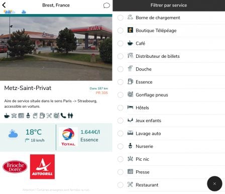 Des filtres permettent de trier les aires de repos selon certaines catégories. Ainsi, il est possible d’afficher par exemple seulement les aires disposant d’un restaurant. Enfin, une fonction de recherche permet de retrouver une aire de repos sur son trajet selon un mot clé : essence, toilettes, pique-nique, etc.